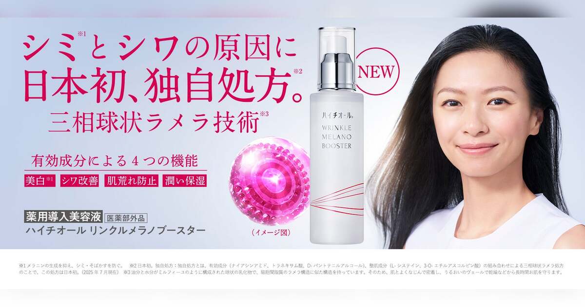 エスエス製薬株式会社(本社:東京都新宿区、代表取締役社長:ニクヒレッシュ・カルラ)のハイチオールブランドは、2025 年 7 月 1 日(火)に、薬用導入美容液『ハイチオール リンクルメラノブースター』(医薬部外品)を EC 限定で発売します。多くの人が抱えるシミ・シワ悩みに着目し、日本初のハイチオール独自処方で美白とシワの改善を同時に実現できる商品設計にしています。厳選された3つの有効成分「トラネキサム酸」、「ナイアシンアミド」、「D-パントテニルアルコール」を配合し、美白、シワ改善、肌荒れ防止、潤い保湿の4つの機能を持つ「ハイチオール リンクルメラノブース
