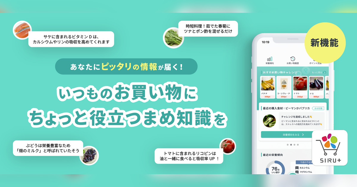 シルタス株式会社(本社:東京都港区、代表取締役:小原一樹、以下「当社」)は、2025年7月1日より、栄養管理アプリ「SIRU+(シルタス)」に新機能「お役立ちコンテンツ」β版をリリースいたします。本機能は、ユーザーの購買データや栄養状態をもとに、アプリ内で食品に関する知識や活用法をパーソナライズして配信します。日々の買い物に新たな発見をもたらし、マンネリ化しがちな買い物を解消して、より楽しく健康的になることを目指します。