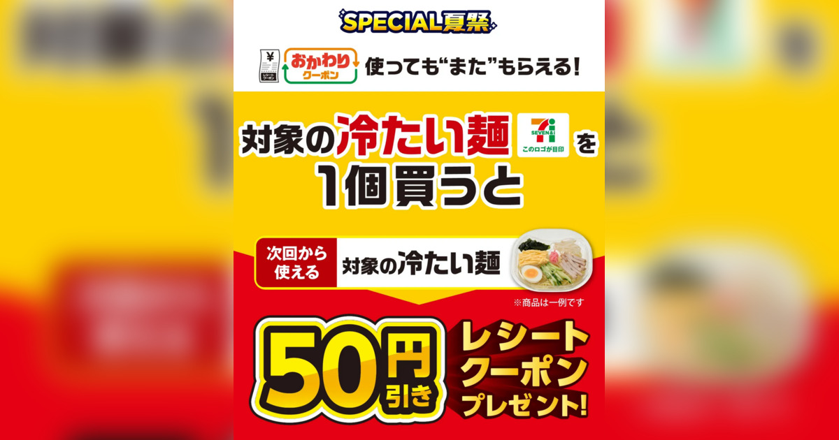 対象の冷たい麺を1個買うたびに、次回使える50円引きレシートクーポンが1枚もらえ、さらに期間中50円引きレシートクーポンを使って購入した場合でも、新たな50円引きレシートクーポンが「何度でも」発券されるお得なキャンペーンです。この夏においしいセブン‐イレブンの「冷たい麺」を楽しんでいただける機会をご提供いたします。