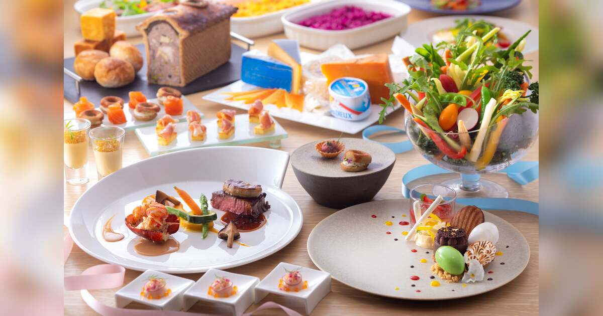 料理は、アミューズ・ブーシュをテーブルへサーブしたのち、前菜、サラダ、チーズ、スープ、ホテルブーランジェが焼き上げたパンをブッフェ形式でお召しあがりいただきます。そして、メインディッシュ「オマール海老のロティと牛肉のロッシーニ」、華やかなデザートプレートはテーブルへサーブいたします。