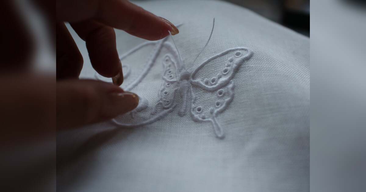 白いリネン布に白い刺繍。立体感のあるサテンステッチ、アイレット(穴)で作り出す表現(福田彩)
