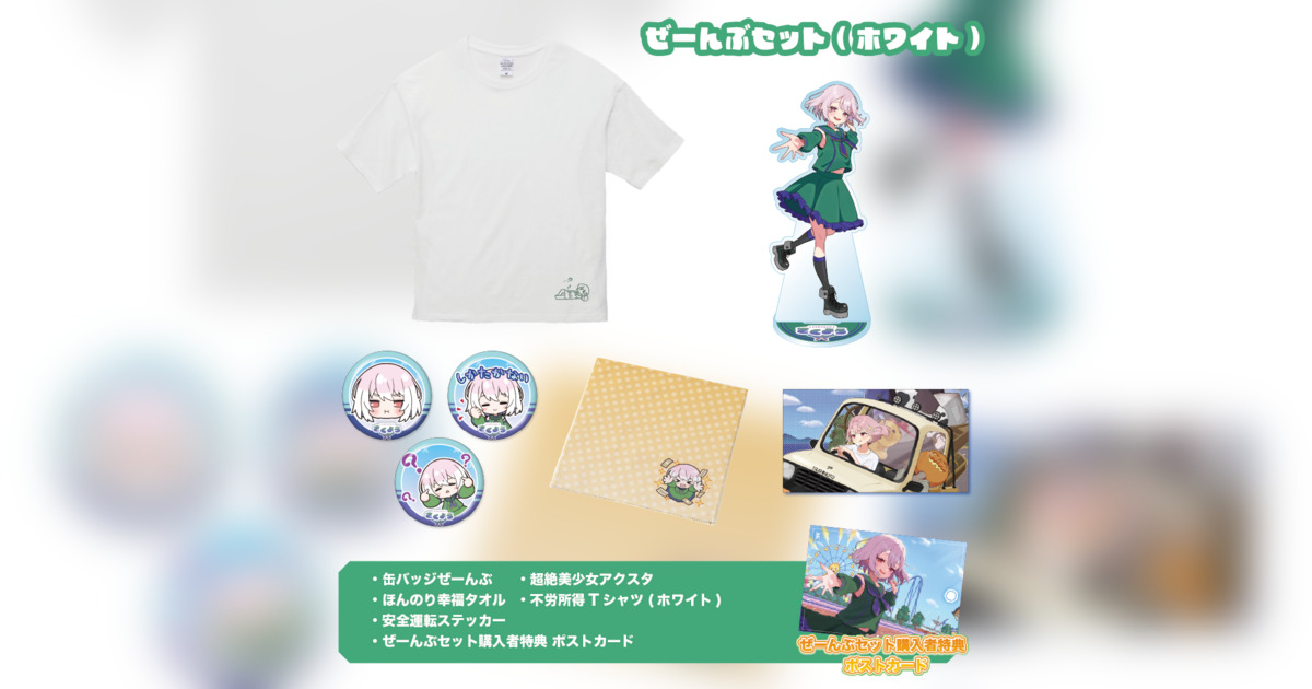 Tシャツ、アクリルスタンド、缶バッジ、ハンドタオル、ステッカーに加え、すべてを詰め込んだ「ぜーんぶセット」も展開。セット購入者限定の特典ポストカードもご用意しています。