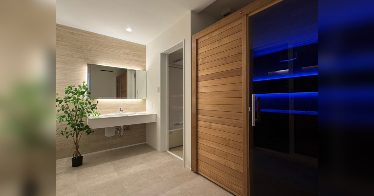 サウナまわりの導線にもこだわりが詰まっており、サウナ・浴室から、ガレージのととのいスペースにダイレクトにアクセスできるようになっています。水回りにはReFa ULTRAFINE BUBBLE SUIGENを採用。暮らしの隅々まで上質に整っています。
