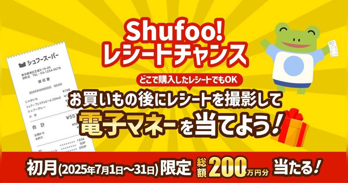 TOPPANグループの株式会社ONE COMPATH(ワン・コンパス)が運営する電子チラシサービス「Shufoo!(シュフー)」は、Shufoo!アプリ内でレシートを撮影・投稿すると毎月抽選で電子マネーが当たる新サービス「Shufoo!レシートチャンス」を開始します。本サービスはShufoo!掲載店舗以外のレシートも対象とし、対象購入期間中どこで購入したレシートでも応募いただけます。