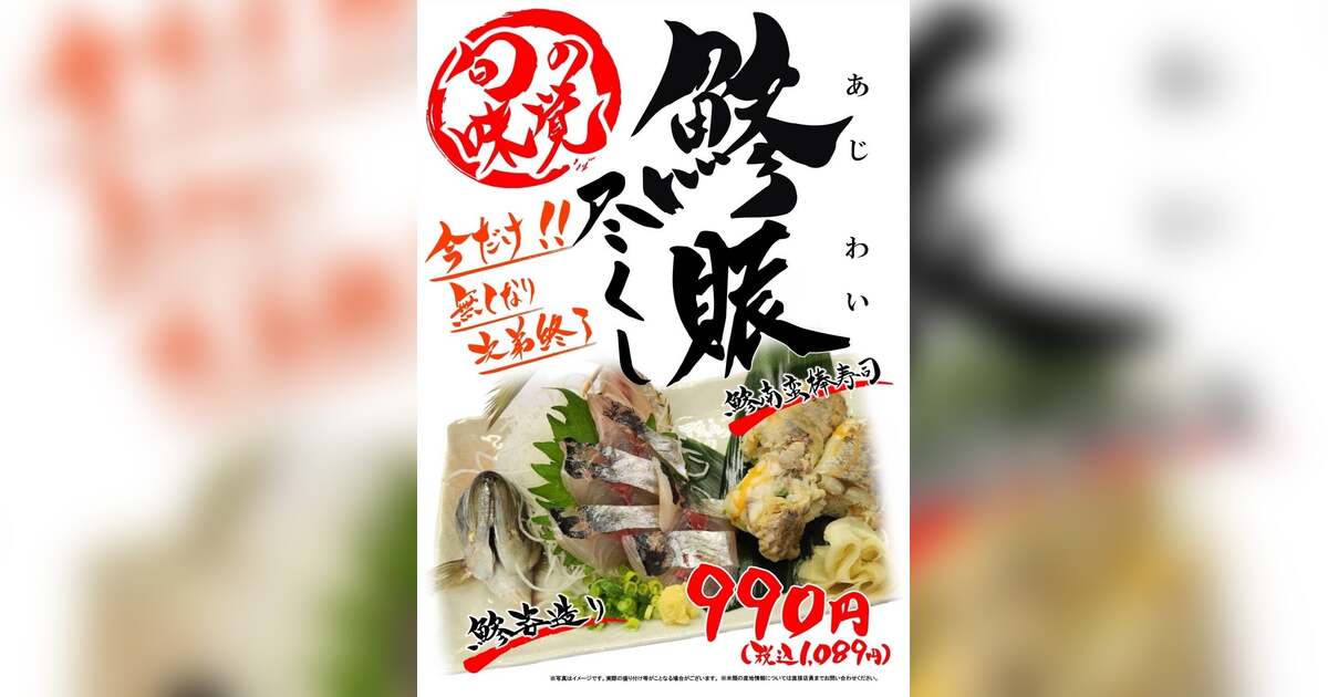 東京と埼玉で展開する海鮮居酒屋「鮨のえん屋」では7月より旬な「鯵(あじ)」の美味しさを食べつくす「鯵賑(あじわい)尽くし」を数量限定メニューで販売いたします。甘酢を絡めた南蛮風味「鯵南蛮棒寿司」に脂が最高潮の新鮮な美味しさの詰まった「鯵姿造り」をセットでご提供いたします。食材が無くなり次第終了の「今だけの鯵の味わい」をお楽しみください。皆様のご来店を心よりお待ちしております。
