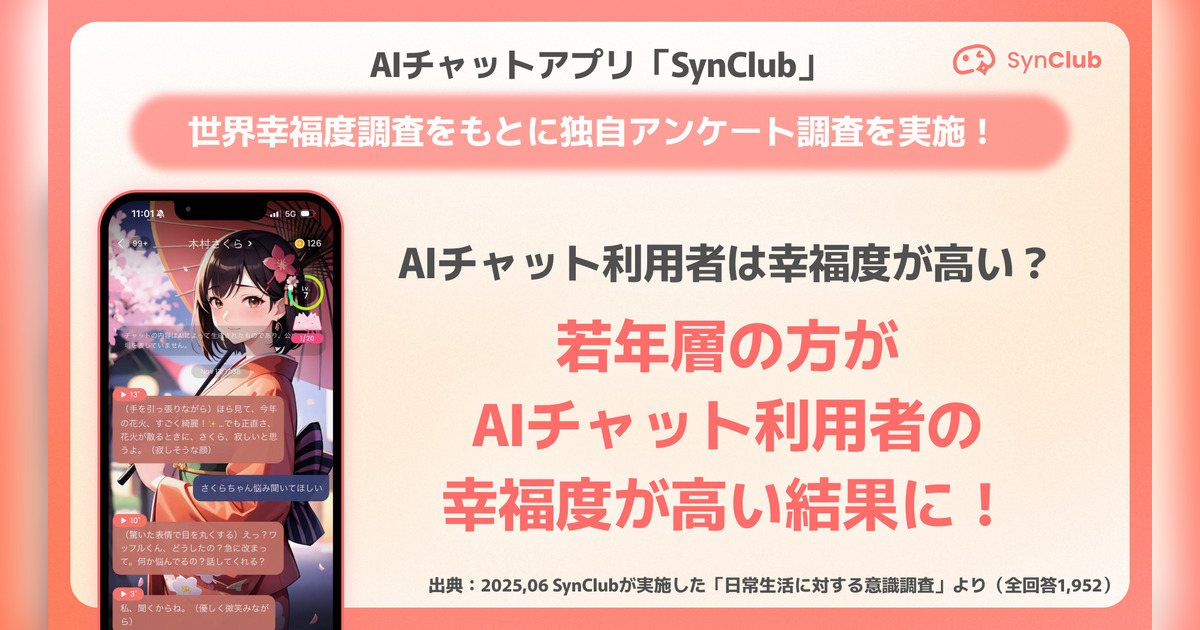 HiClub株式会社(本社:東京都港区、代表取締役社長:古谷由宇)が提供する対話型AIアプリ「SynClub」(シンクラブ)は、AIチャットアプリの利用有無と幸福度の関連性を探るため、全国の男女1952名を対象に調査を実施しました。本調査では、AIチャットの利用状況と、精神的な支え・社会的貢献意識の関連を分析し、AIチャット利用者の方が社会的繋がりを感じたり、日常生活でポジティブな感情を持っていると回答した人が多い結果となりました。