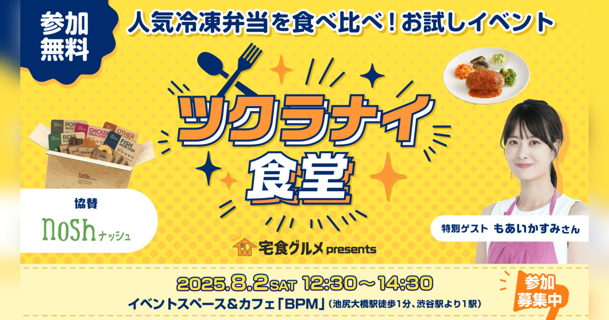 DX&マーケティング事業を展開するナイル株式会社(本社:東京都品川区、代表取締役:高橋 飛翔、以下、ナイル)は、自宅での食事がより楽しくなるライフスタイルを提案するWebメディア「宅食グルメ」にて、体験型リアルイベント第2弾「ツクラナイ食堂」を2025年8月2日(土)に開催いたします。