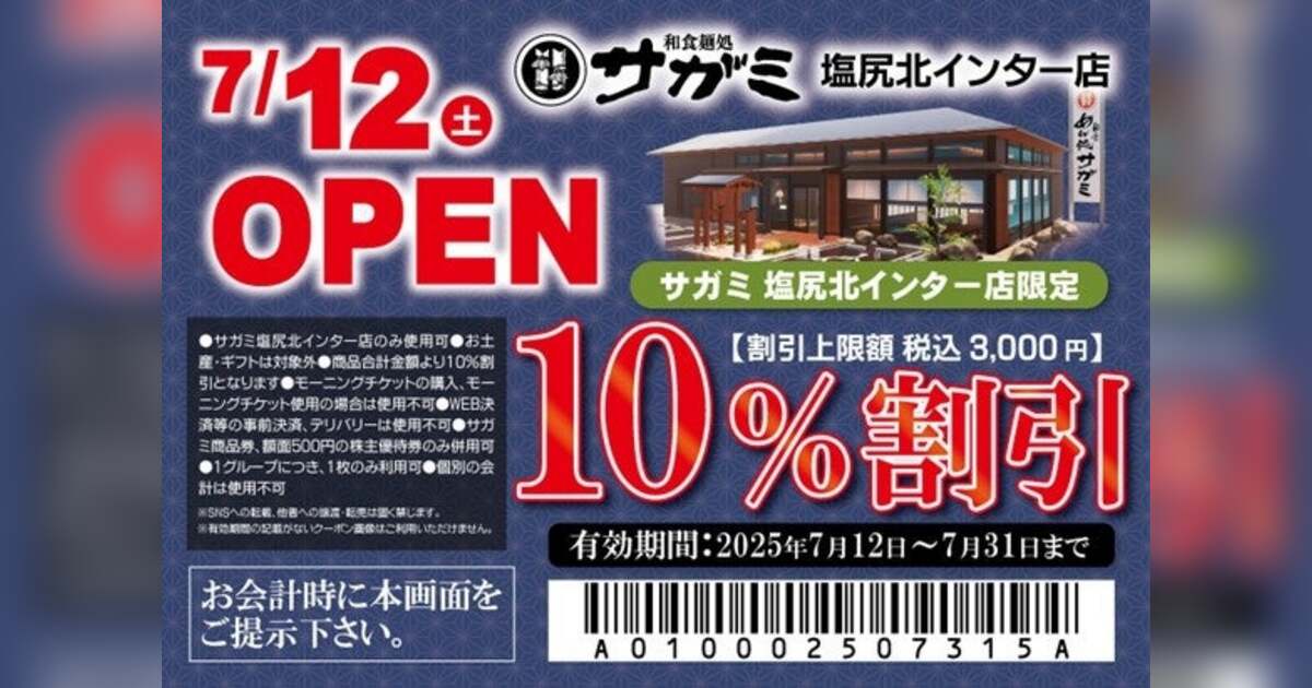 株式会社サガミホールディングスのグループ企業であるサガミレストランツ株式会社(本社:愛知県名古屋市守山区八剣二丁目118番地 代表取締役社長 鷲津 年春)は、2025年7月12日(土)に、「和食麺処サガミ塩尻北インター店」をグランドオープンいたします。