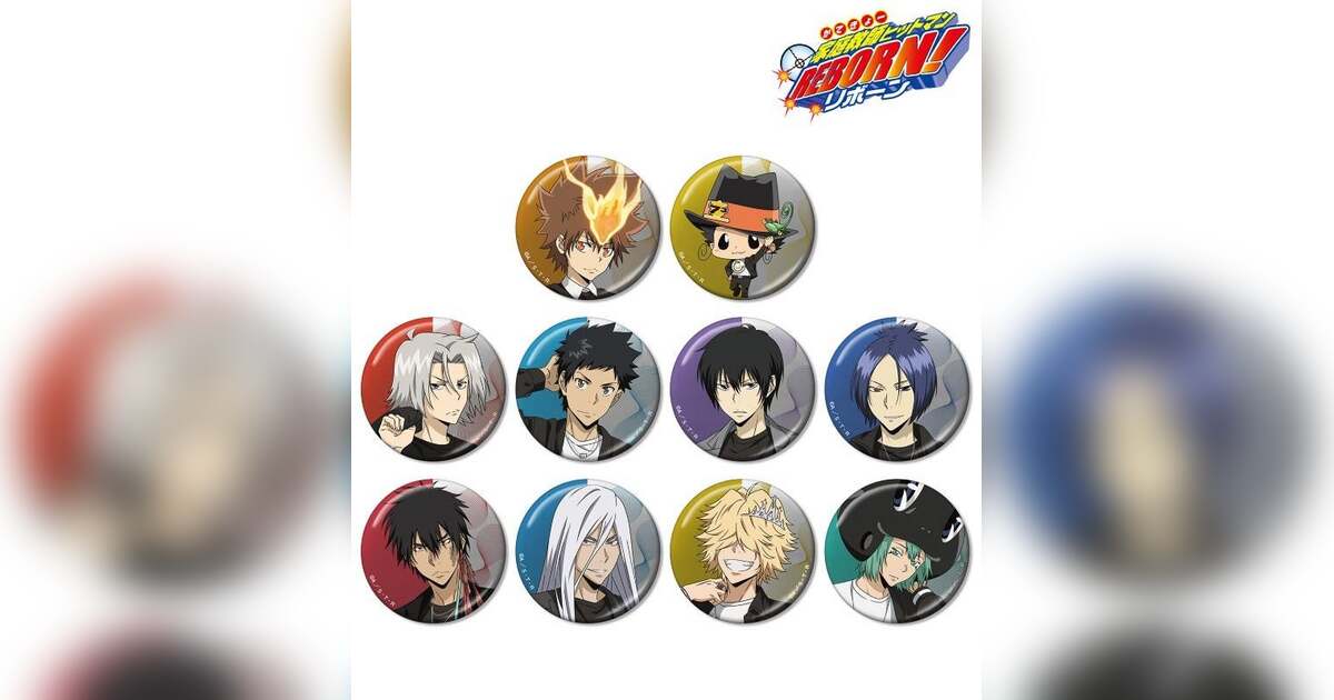 沢田 綱吉、リボーン、獄寺 隼人、ビアンキ(10年後)、山本 武、スペルビ・スクアーロ(10年後)、雲雀 恭弥、ディーノ(10年後)、六道 骸(10年後)、フランをメタリック仕様の缶バッジに仕上げました。