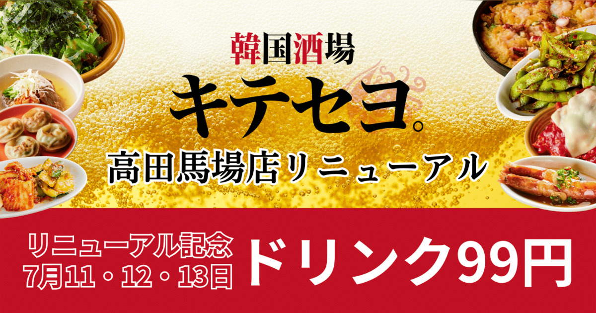 『韓国料理酒場ナッコプセのお店 キテセヨ 高田馬場店』がちょっぴり大人向けの『韓国酒場キテセヨ。 高田馬場店』にリニューアル!リニューアル記念で7月11日~13日の3日間はドリンク一杯99円!