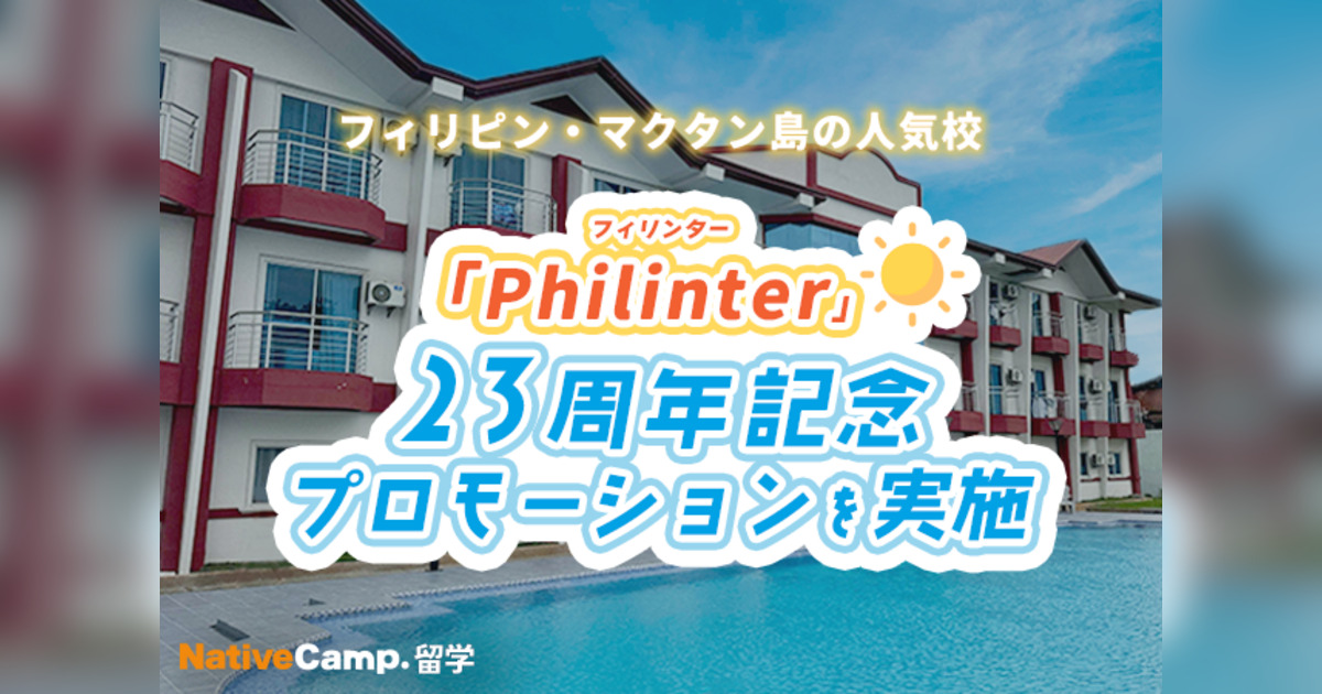 ネイティブスピーカーと回数無制限のオンライン英会話サービス「ネイティブキャンプ英会話」を展開する株式会社ネイティブキャンプ(東京都渋谷区 代表取締役: 谷川国洋)は、海外留学エージェントサービス「ネイティブキャンプ留学」において、フィリピン・セブの人気校「Philinter」にて、23周年記念プロモーションを実施いたします。
