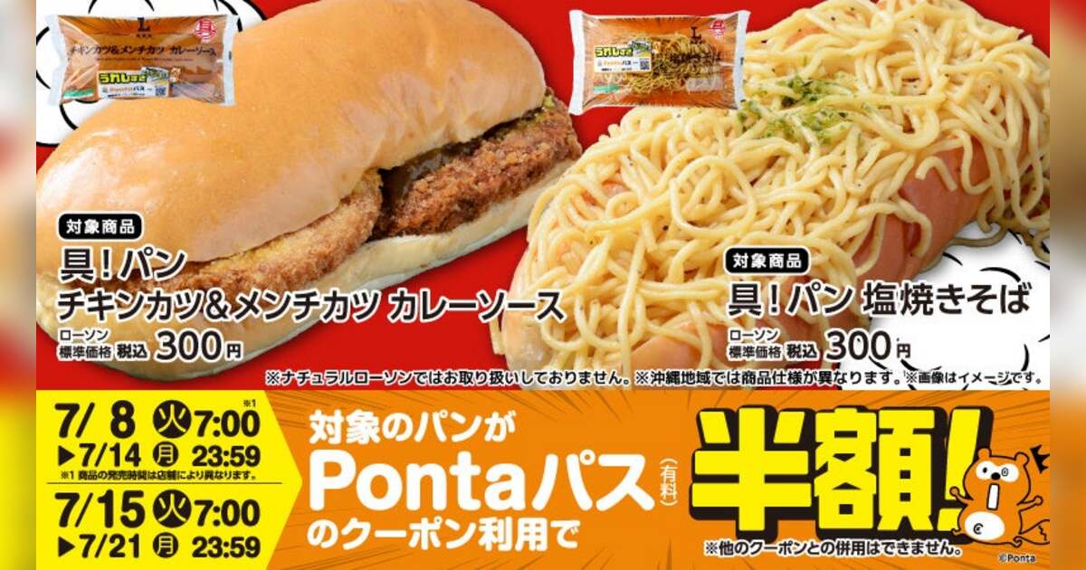 KDDIは2025年7月8日、約1,500万人が利用しているおトクなサブスクリプションサービス「Pontaパス」とローソンのコラボ商品として、オリジナル商品「具!パン チキンカツ&メンチカツ カレーソース」「具!パン 塩焼きそば」を全国のローソン(ナチュラルローソン、ローソンストア100を除く)で発売します。Pontaパス会員限定の特典として、「ウィークリーLAWSON」の割引クーポンをご利用いただくと、半額(300円→150円)で購入いただけます。