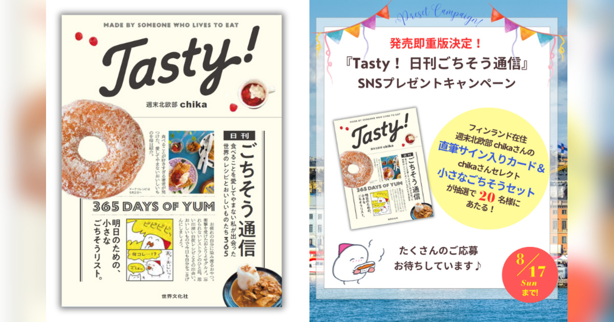 重版を記念して『Tasty! 日刊ごちそう通信』直筆サイン入りカード&チカさんセレクト小さなごちそうセットがあたる!SNSプレゼントキャンペーンを開催します。