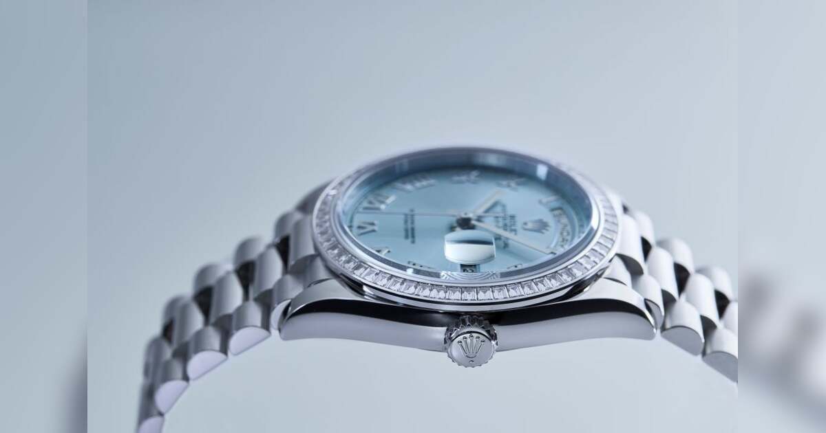 ロレックスにおけるハイエンドコレクションのデイデイト。貴金属でのみ展開され、フルスペルの曜日表示は唯一となる。アイスブルーダイヤルはロレックスのプラチナ製モデルにおいて特別で、デイデイト・コスモグラフデイトナ・パーペチュアル1908・ランドドゥエラーでのみ展開。ベゼルにはバゲットカットダイヤが施され、ラグジュアリーかつクールな世界観を纏っている。半円形の3列リンクプレジデントブレスレットが気品高い雰囲気をさらに引き立てている。