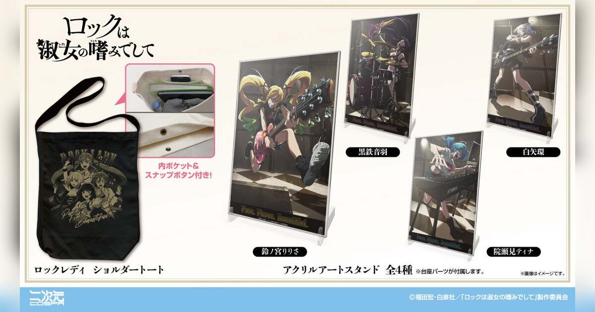「鈴ノ宮りりさ」「黒鉄音羽」「院瀬見ティナ」「白矢環」4人それぞれのライブ中の演奏シーンを楽しめる「アクリルアートスタンド」と、耐久性の高い「ショルダートート」が二次元コスパから登場。