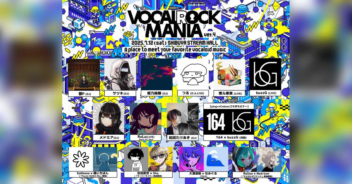 いよいよ来週末に迫ってきた「VOCALOCK MANIA ver.4」の最後の出演者164が出演することが発表され、タイムテーブルも解禁された。今回はVOCALOCK STAGEで煮ル果実、和田たけあき、サツキなどのライブとDJのパフォーマンスが行われ、MANIA STAGEでは大漠波新、なみぐる、吉田夜世、Shuらによる楽曲解説や対談が行われるが、楽器・音楽制作 初心者に向けたリットーミュージックの動画教則サイト「plug+(ぷらぷら)」とSteinberg社の音楽制作ソフトウェア「Cubase」のコラボセミナーとして「天ノ弱」や「タイムマシン」を代表曲に持つボカロP「164」とbuzzGの対談が決定した。