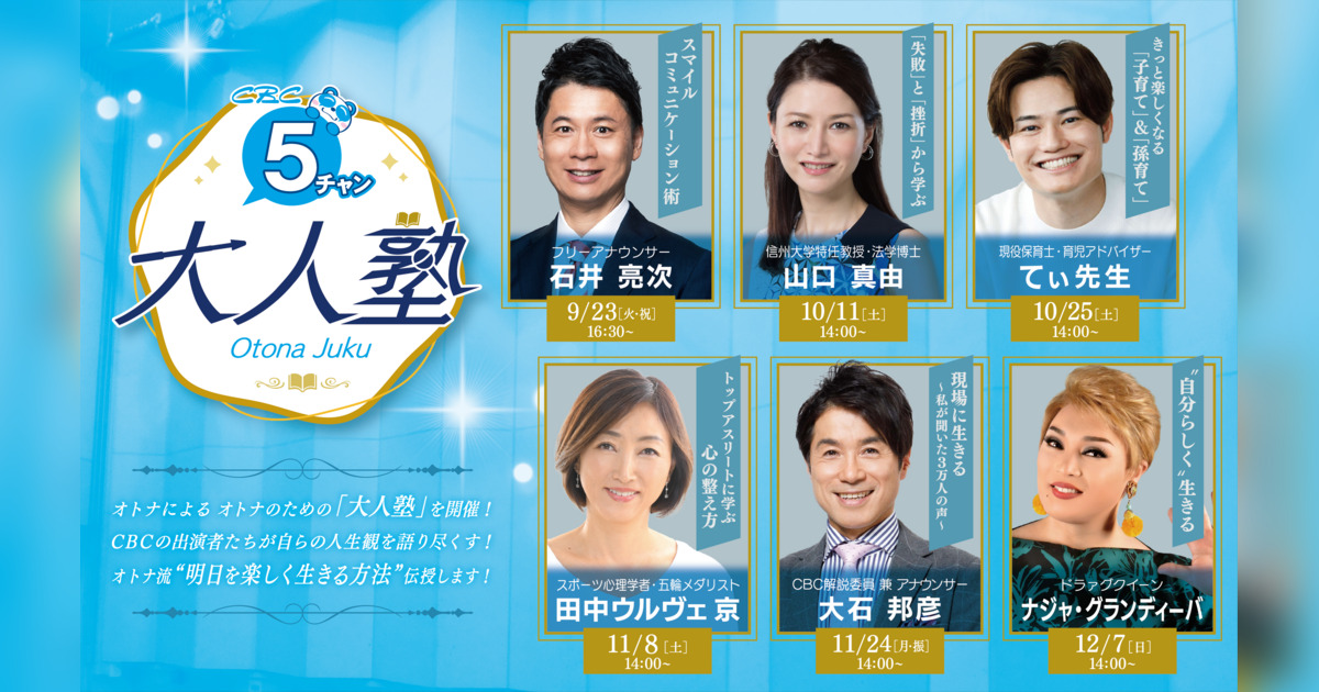 ※チケット購入の際に取得したお客様の個人情報は、「5チャン大人塾」の受講証の発行及び入場受付など、「5チャン大人塾」関連のみに使用します。法令などにより開示を求められた場合を除き、お客様の同意なしに個人情報を業務委託先以外の第三者に提供することはありません。そのほかお客様の個人情報の取り扱いについてはCBCテレビホームページの「個人情報のお取り扱いについて」をご覧ください。
