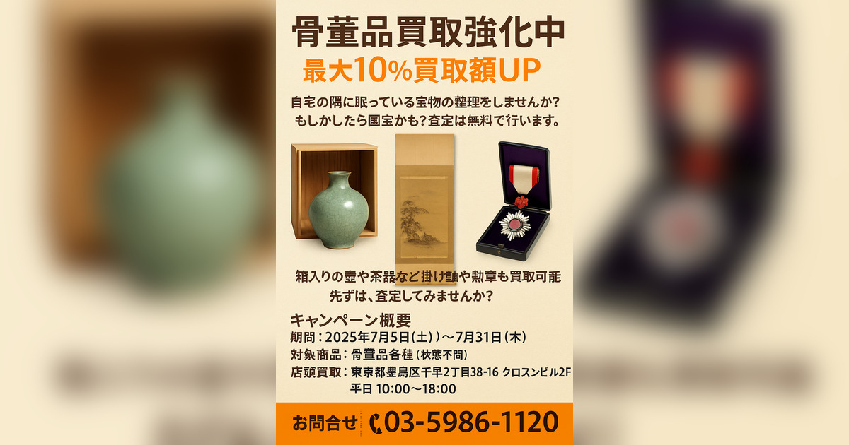 株式会社クロスワン(本社:東京都豊島区、代表取締役:品川あきら)が運営する「クロスワン・リユース事業部」および「おたからや千川駅前店」では、2025年7月5日(土)から7月31日(木)までの期間、骨董品買取額が最大10%アップするキャンペーンを実施中です。