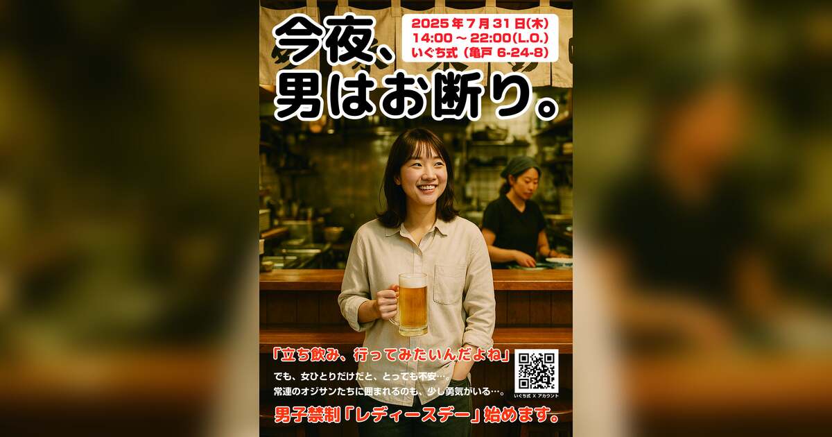 2025年7月31日(木)、亀戸の立ち飲み屋「いぐち式」(亀戸6-24-8)にて“女性のみ入店可能”な完全女性限定「レディースデー」を開催します。立ち飲み文化の中でも、入店制限を設けた女性限定イベントは極めて珍しいと思われます。