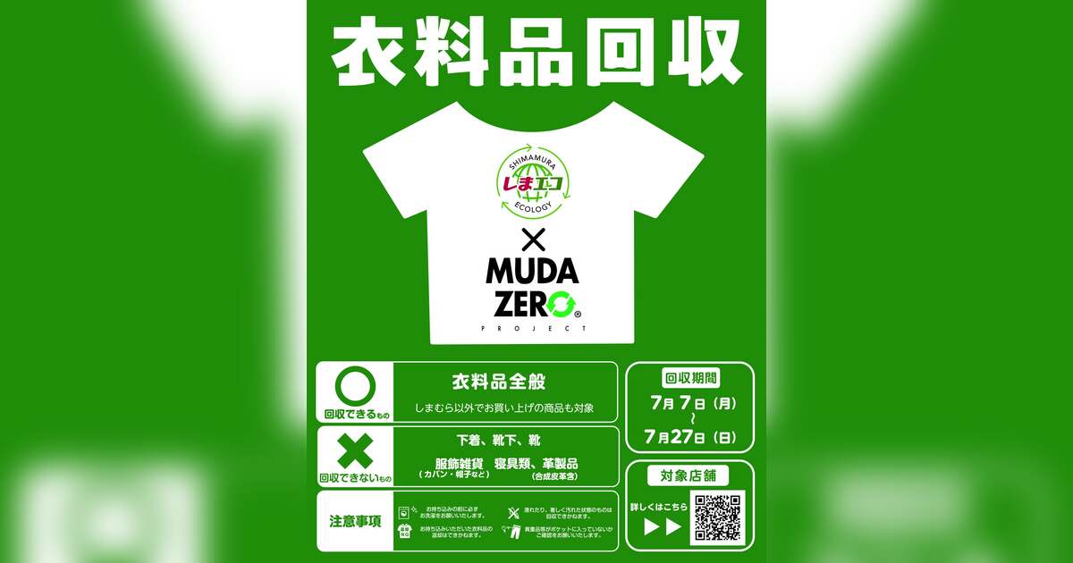 株式会社しまむら(本社所在地:埼玉県さいたま市大宮区北袋町1-602-1、代表取締役:高橋 維一郎)は、7月7日(月)から7月27日(日)まで、衣料品回収をしまむらグループ900店舗で実施します。2024年に一部店舗で衣料品回収を開始し、これまでに約73トンの衣料品を回収しています。店舗で回収した衣料品は、株式会社カイタックファミリーの「MUDAZERO」プロジェクトを通じて服から服へのリサイクルを行っています。