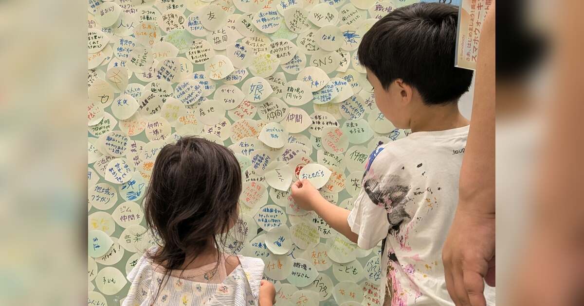 来場者から募集したメッセージは、それぞれが大切に思う「つながり」などのエピソードです。家族や友達、趣味でつながった仲間のことなど、葉っぱ型の付箋に書かれた言葉がメッセージツリーの一葉となり、集まるにつれて彩られていきました。まだ字の書けない子どももペンを取り、あらゆる世代の人が400枚以上の葉っぱを張り付けてくれました。