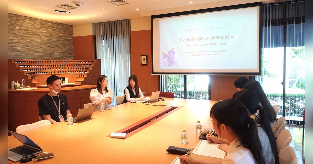 この取り組みに賛同し、将来を担う優秀な人材育成に貢献したいと考え、“働くこと”をリアルに考えていただくため大阪本社にて対面での受け入れプログラムを実施。営業職や研究員とのディスカッションのほか、化粧品や香料を見て触って香りを嗅ぐ等、五感を使い、さらに実際に働いている社員の姿を間近で見学することで、“働く”ことを身近に感じていただきました。