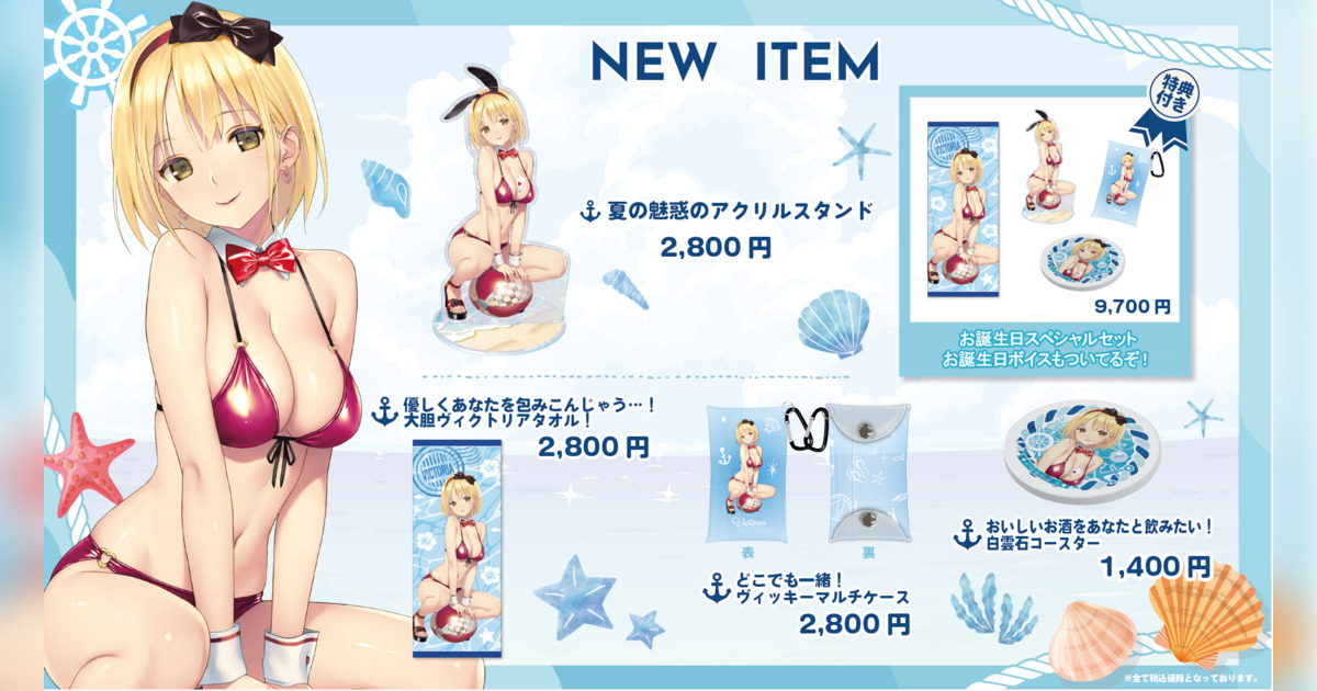今回登場するのは、夏らしい装いをまとった描き下ろしイラストを使用したアクリルスタンドや、持ち運びに便利なマルチケース、お酒好きな彼女らしさ全開の白雲石コースター、そして大胆なビジュアルのタオルなど、ファン必見のラインナップ。