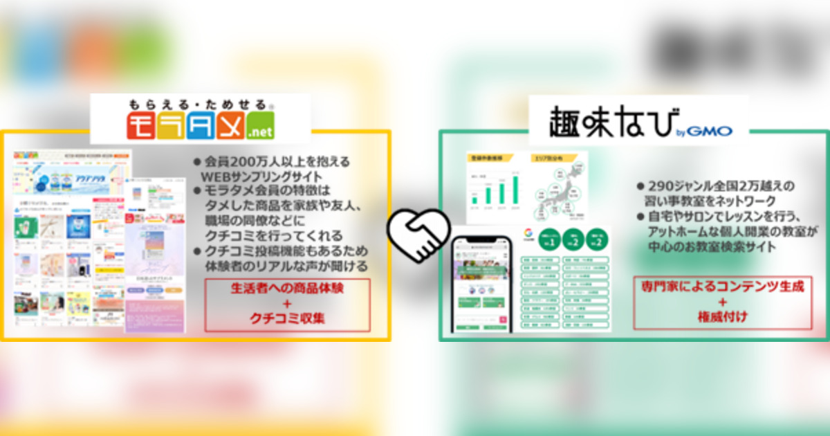 『モラタメ』は、会員ユーザーが新商品を手軽に「もらって試せる」サンプリングサービスとして、多くの生活者とメーカーをつないできました。一方、『趣味なび byGMO』は全国17,600人以上の先生ネットワークを通じて、趣味・習い事などの体験機会を提供するプラットフォームとして成長しています。 今回の協業により、商品を教室の先生に使ってもらうことで、より専門性の高い体験型サンプリングが実現し、高い商品理解を踏まえたユーザーへの発信を行うことが可能になります。