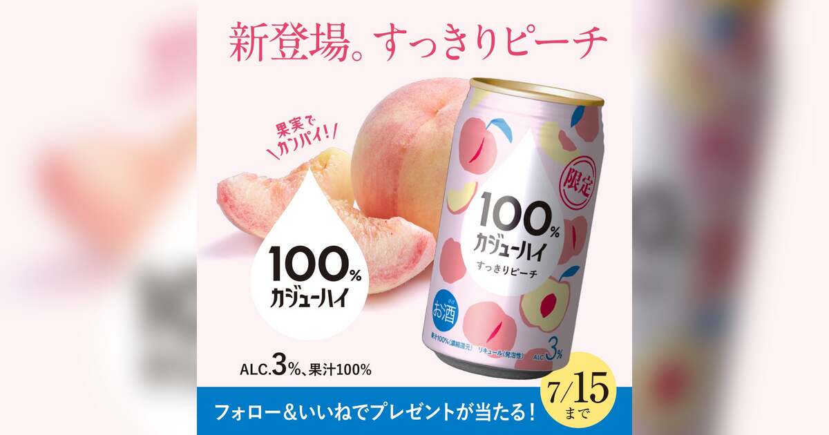 富永貿易株式会社(本社:兵庫県神⼾市)は、100%カジューハイ<すっきりピーチ>新発売を記念し、『100%カジューハイ』の公式SNSアカウント(X・Instagram)にて、「100%カジューハイ12本セット」が総計10名に当たる「100%カジューハイ すっきりピーチ新発売キャンペーン」を実施いたします。