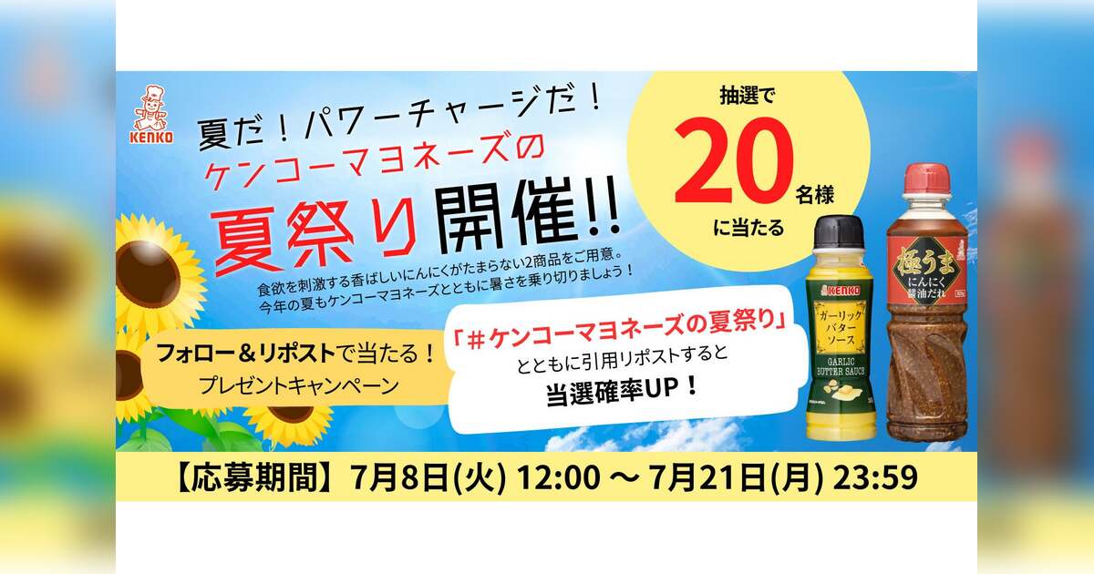 ケンコーマヨネーズ株式会社(東京本社:東京都杉並区、代表取締役社長:島本 国一、以下「当社」)は、日頃のご愛顧に感謝し、当社公式Xをフォロー&リポストすると、当社人気の2商品がセットで当たるキャンペーンを本日7月8日(火)から7月21日(月)まで実施します。