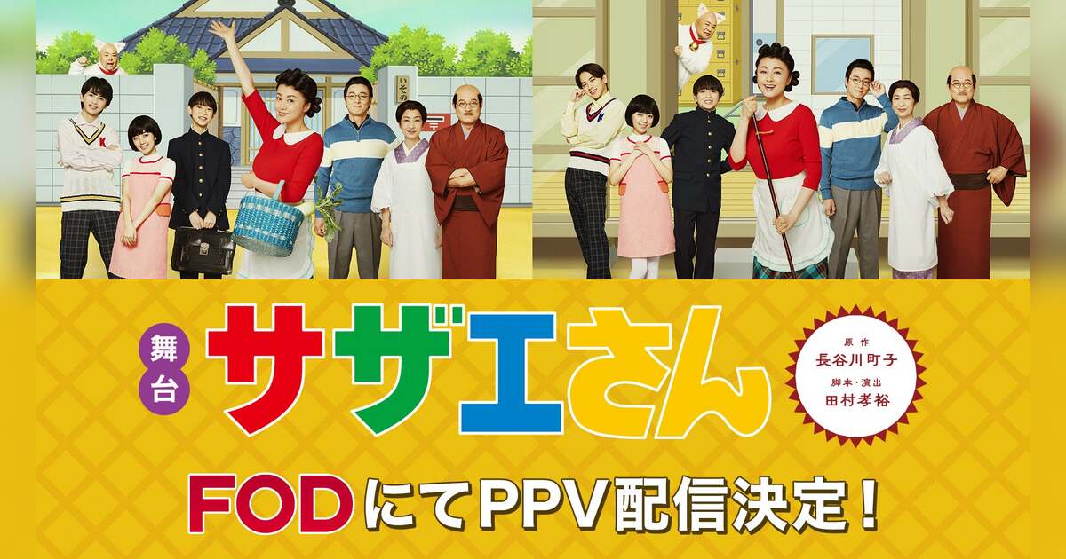 フジテレビが運営する動画配信サービスFODのPPV(ペイ・パー・ビュー)にて、舞台『サザエさん』を7月19日(土)より配信することが決定しました。懐かしくも新しい“10年後のサザエさん”を、自宅でゆっくり楽しめるチャンスです。さらに、PPV配信を記念して豪華キャストと一緒に舞台を振り返るスペシャル同時視聴配信の実施も決定!