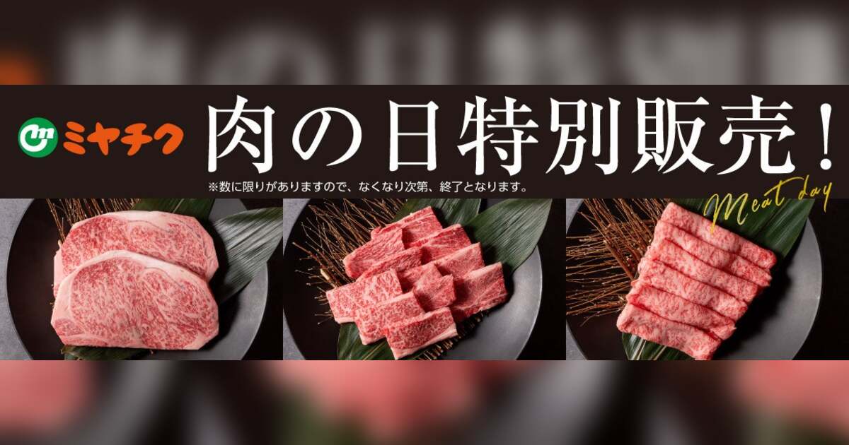 株式会社ミヤチク(本社:宮崎県都城市/代表取締役社長:船ヶ山 祐二)が運営する通販サイト「ミヤチクオンラインショップ」にて、5/29(木)に限り、宮崎牛や宮崎県産豚肉を特別価格でお買い求めいただける”肉の日特別販売”を開催します!