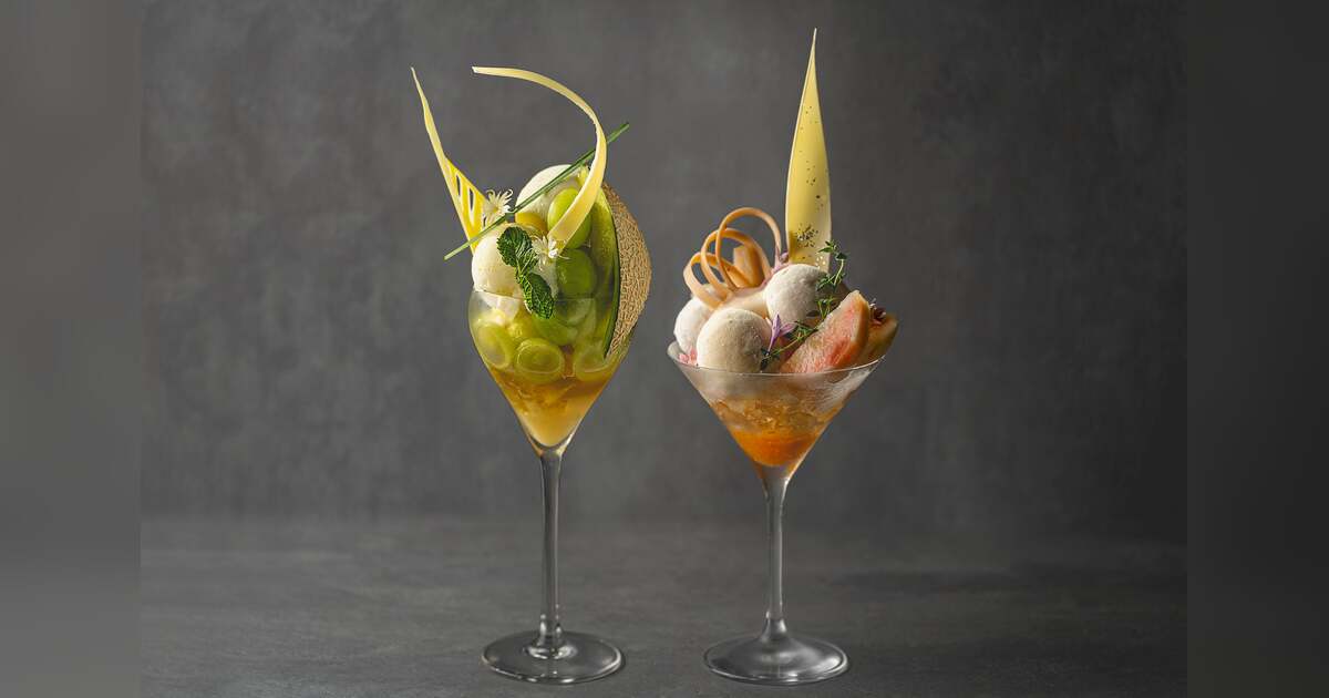 マスカットとメロンの果実が華やかにトップを彩ります。マスカットソルベとメロンアイスが爽やかに重なり、バニラアイスがまろやかなコクをプラス。ベルガモットのエスプーマが軽やかな香りを添え、ココナッツパウンドケーキがほんのりとした甘さと深みを加えます。グラスの底には、ジャスミンティージュレと洋ナシのピューレが控え、最後のひと口まで涼やかで上品な余韻が続きます。