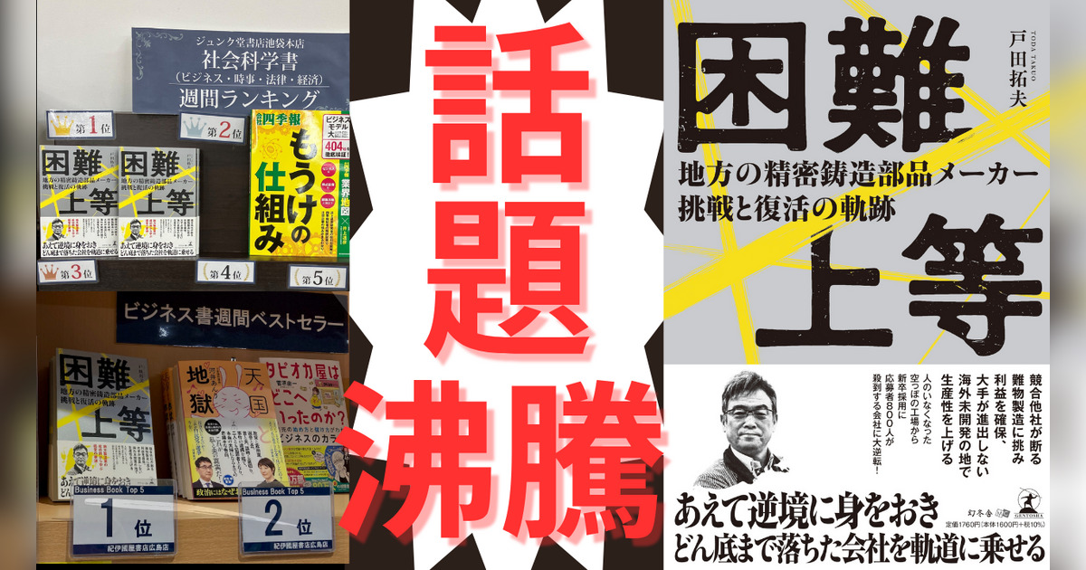 精密金属部品メーカーである株式会社キャステム(本社:広島県福山市)の代表、戸田拓夫の著書である『困難上等 ― 地方の精密鋳造部品メーカー 挑戦と復活の軌跡』が、全国の書店の週間売り上げランキングで続々と1位を獲得しています!