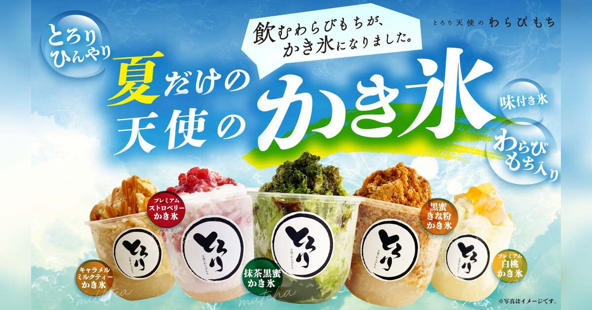 「天使のかき氷」は、和三盆糖を使用したとろっとろのわらびもちに人気ドリンクをそのまま凍らせて、ふんわりと削った新感覚かき氷です。仕上げには果肉たっぷりなソースや黒蜜などを贅沢にトッピング。まるで「飲むわらびもち」をそのまま冷たいスイーツにしたような、暑い季節にピッタリのひんやりご褒美です!