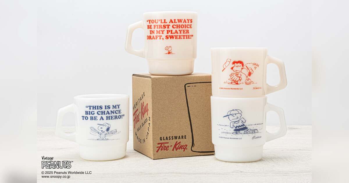 1960年〜70年代の PEANUTS「ベースボール」アートを配した Fire-King 新作アイテム