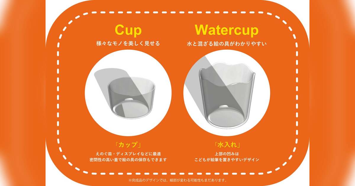 Cup:2歳児が使いやすい絵の具皿。ディスプレイ什器としても機能する。蓋付きで保存が可能。クリアな透明素材で、観察を促す。