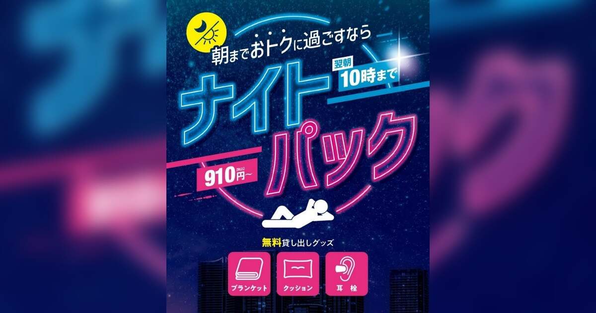 「ナイトパック」は、最大12時間ご利用可能な長時間パックです。終電を逃したときはもちろん、朝までゆっくり過ごしたい方にも最適です。