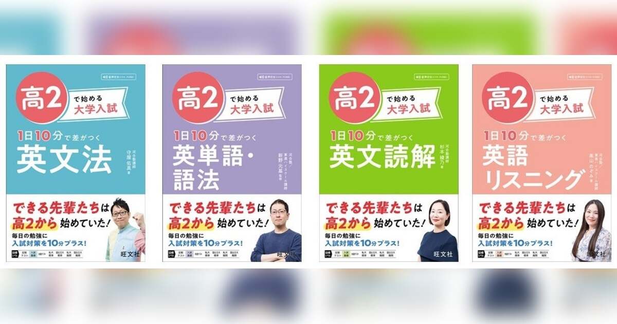教育出版の株式会社旺文社(東京都新宿区/代表取締役社長 粂川 秀樹)は、「高2で始める大学入試」シリーズとして『1日10分で差がつく 英文法』『1日10分で差がつく 英単語・語法』『1日10分で差がつく 英文読解』『1日10分で差がつく 英語リスニング』を7月10日(木)に刊行いたしました。