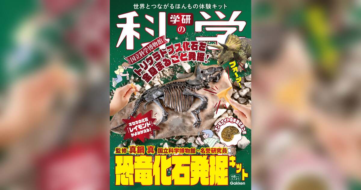 『学研の科学』は、体験キットの「恐竜化石発掘キット」、恐竜や化石などについての記事が満載の本誌、別冊の学研まんが「ひみつシリーズ」、実験の投稿やオンラインワークショップに参加できるオンラインコミュニティ「あそぶんだ研究所」がセットになって、ほんものの科学体験をお届けします。
