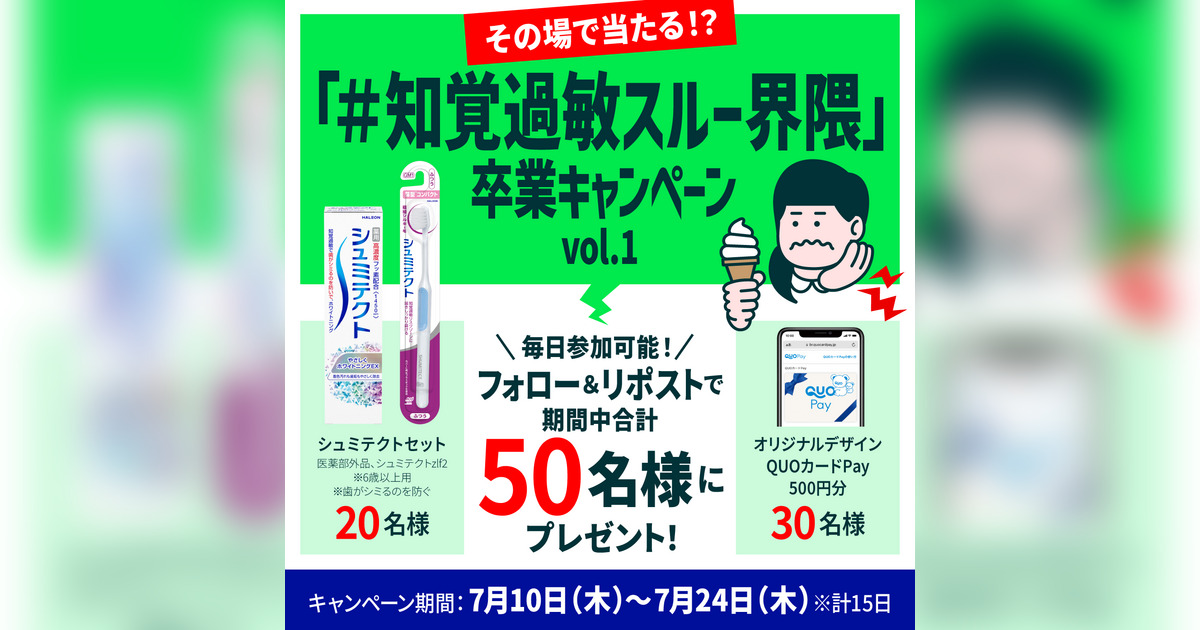 Haleonジャパンは、「#知覚過敏スルー界隈」からの卒業を後押しすべく、合計150名様にシュミテクト製品やオリジナルデザインQUOカードPayが当たるXキャンペーンを実施します。特に「知覚過敏の日」である7月25日には、1日限定で100名様に景品が当たる特別企画も実施。「#知覚過敏スルー界隈」の皆さまのご参加をお待ちしております。