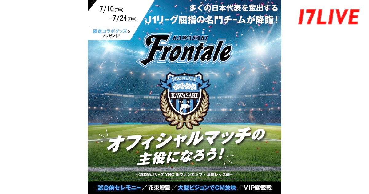 17LIVE株式会社(東京都渋谷区、代表取締役:ジャン・ホンフイ、URL:https://jp.17.live/)が運営する日本最大級のライブ配信アプリ「17LIVE(イチナナ)」は、2025年9月7日(日)に「Uvanceとどろきスタジアム by Fujitsu」で開催されるルヴァンカップ準々決勝の試合前セレモニーへ出演するライバーを決定するイベント、『川崎フロンターレ オフィシャルマッチの主役になろう 〜2025JリーグYBCルヴァンカップ・浦和レッズ戦〜』を、2025年7月10日(木)より開催することが決定しましたので、お知らせいたします。