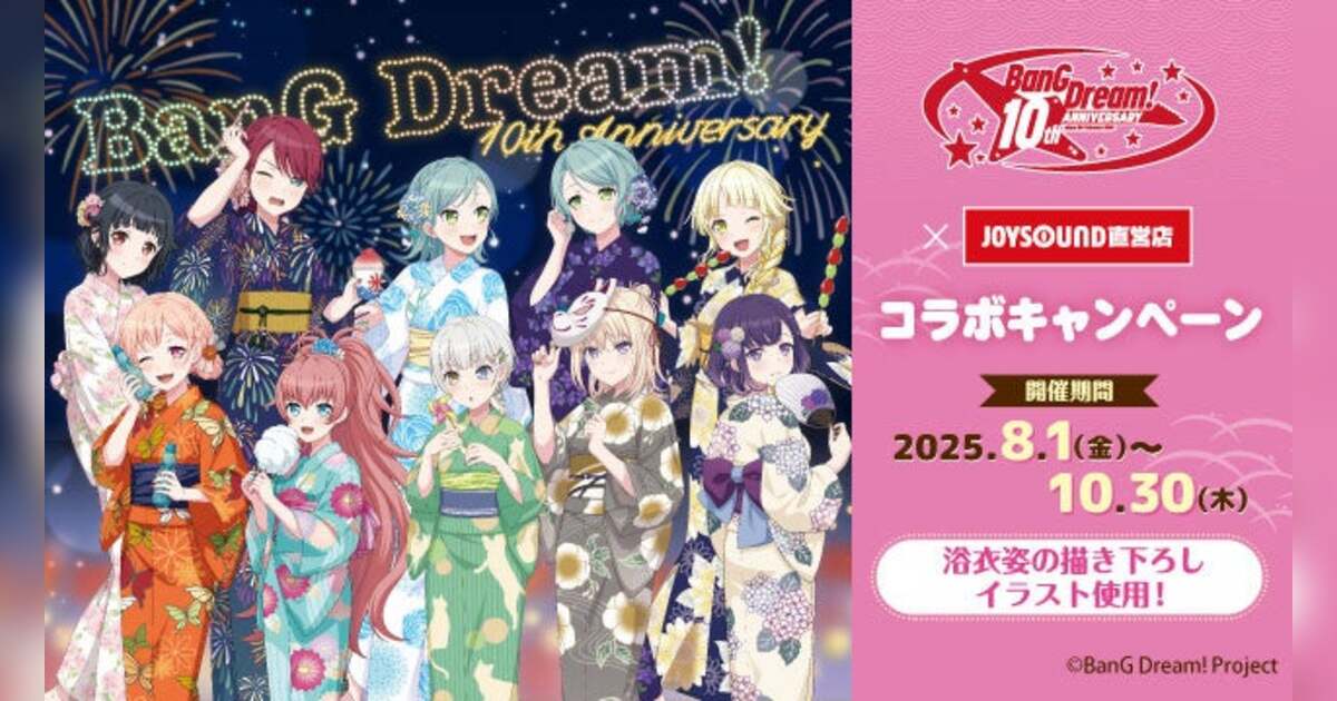 株式会社エクシングの子会社で、全国にカラオケ店舗・ネットカフェ店舗を展開する株式会社スタンダード(本社:東京都港区、代表取締役社長:小林克章)は、2025年8月1日(金)から2025年10月30日(木)までの期間中、バンドリ!10th Anniversary×JOYSOUND直営店コラボキャンペーンと題し、JOYSOUND池袋西口公園前店(東京)・JOYSOUND金山店(愛知)・JOYSOUNDなんば戎橋店(大阪)にカラオケコラボルームをオープン!また、JOYSOUND直営店65店舗にて、オリジナルノベルティ付きコラボドリンクを展開します。当コラボでは、浴衣姿でお祭りを楽しむオリジナル描き下ろしイラストを使用いたします!