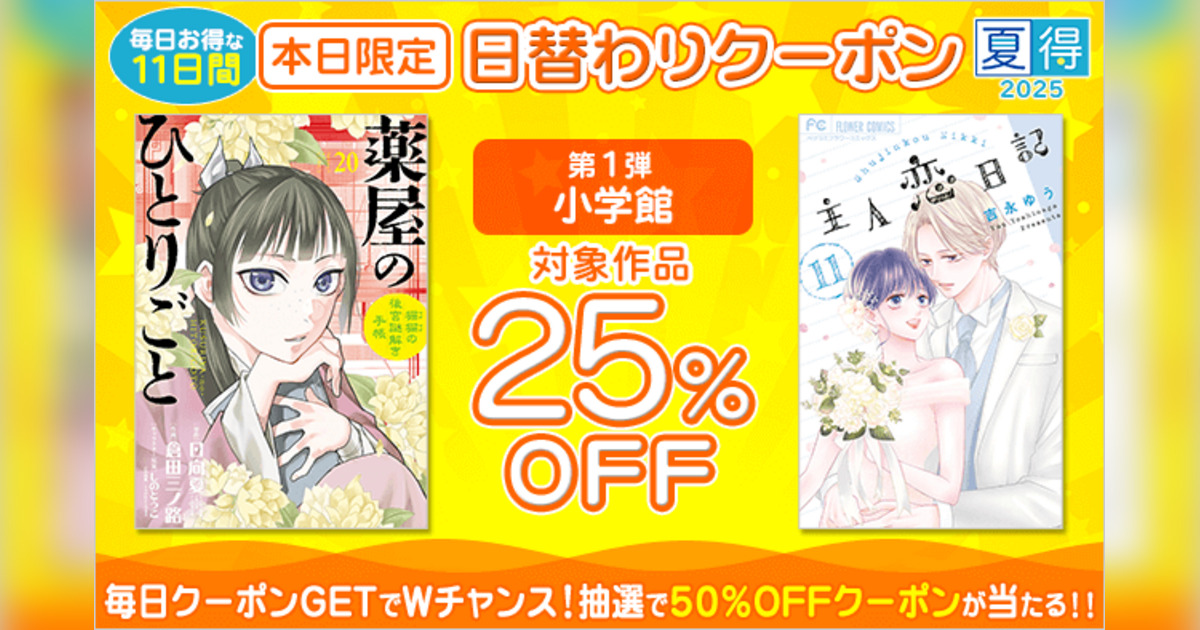 TOPPANホールディングス株式会社のグループ会社である、株式会社BookLive(本社:東京都港区・代表取締役社長:淡野 正)は、運営する総合電子書籍ストア「ブックライブ」にて、7月11日(金)~7月21日(月)の11日間限定で、日替わりで出版社ごとの特別な割引クーポンを配布する「夏得キャンペーン」を開催します。本日開催のキャンペーン第1弾では、小学館の全作品に利用できるお得なクーポンを配布。また、期間中に配布されるすべてのクーポンを取得した方を対象に、抽選で100名様に50%OFFクーポンが当たる特典もご用意しています。