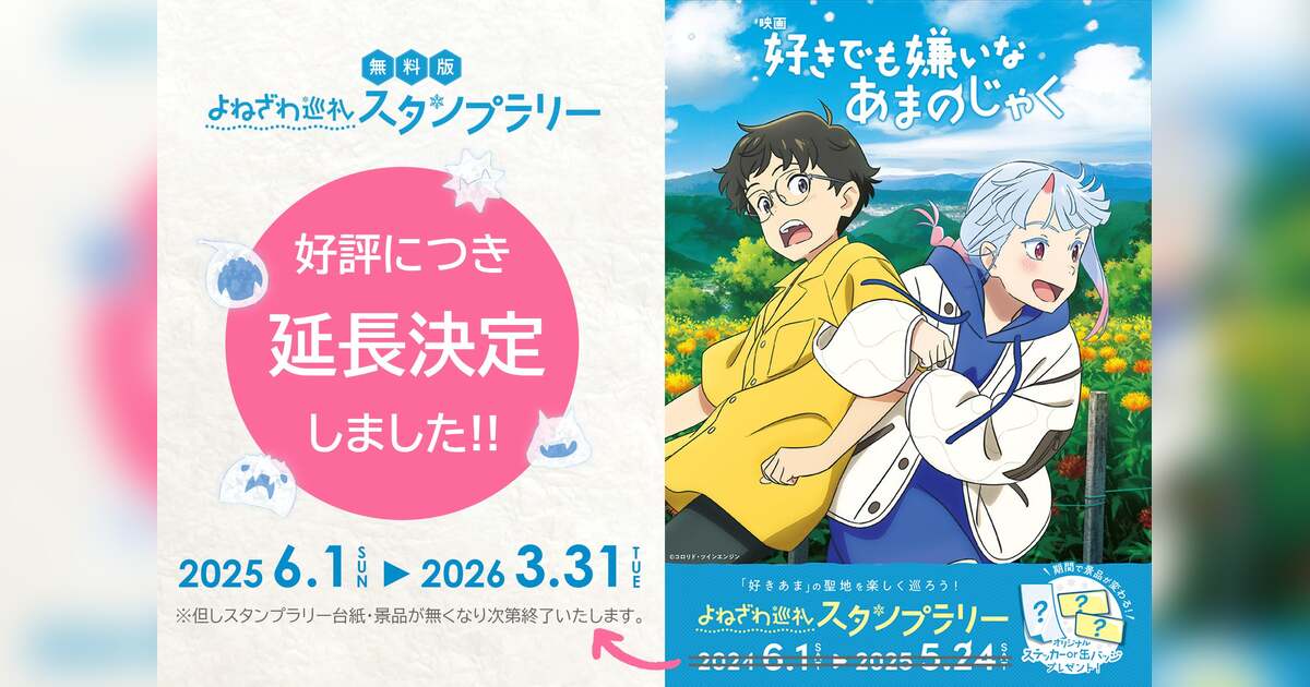 2024年5月24日(金)よりNetflix世界独占配信中の長編アニメーション映画「好きでも嫌いなあまのじゃく」(監督:柴山智隆、企画・製作:ツインエンジン、制作:スタジオコロリド)を全力で応援する「好きあま@米沢応援隊」(運営:米沢アニメツーリズム誘客推進協議会(所在地:山形県米沢市、会長: 伊藤優子))・会員:プラットヨネザワ株式会社(所在地:山形県米沢市、代表取締役 宮嶌浩聡))は「好きあま」のロケ地を楽しく巡る「【無料版】よねざわ巡礼スタンプラリー」の延長を決定いたしました。
