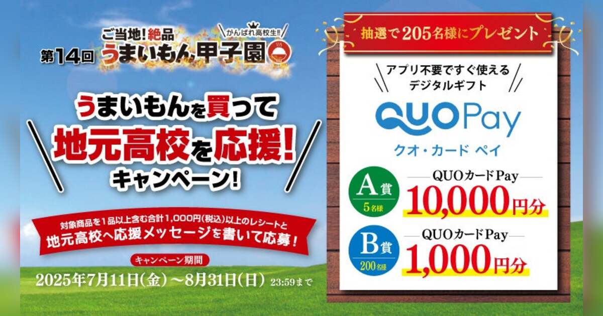キャンペーン期間中、対象商品を1品以上購入した税込み1,000円以上のレシート(オンラインショップご利用の場合は納品書)と、「うまいもん甲子園」に出場する高校生への応援コメントを記入し応募すると、抽選で総勢205名様に最大10,000円分のQUOカードPayがプレゼントされます。