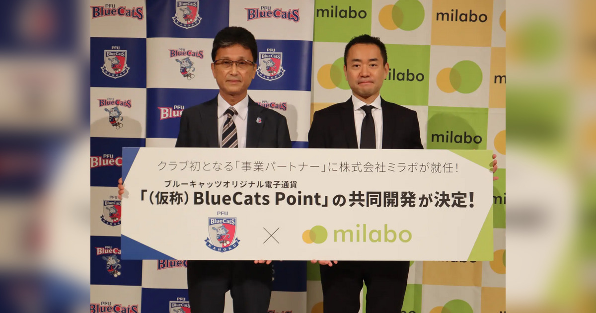 また、本契約に加え、クラブ初となる「事業パートナー」へ就任し、PFUブルーキャッツ石川かほくのクラブのミッションである「地域経済活性への寄与」の新たな一手として、ミラボが自治体ポイント等で蓄積されてきたノウハウ・ナレッジと連携し、オリジナル電子通貨「(仮称)BlueCats Point」を開発いたします。本電子通貨は、ホームゲーム会場や地域の飲食店/ショップ等での活用を想定しており、ミラボの強みである自治体DXサービスや他地域通貨との連携も視野に入れた開発を予定しております。