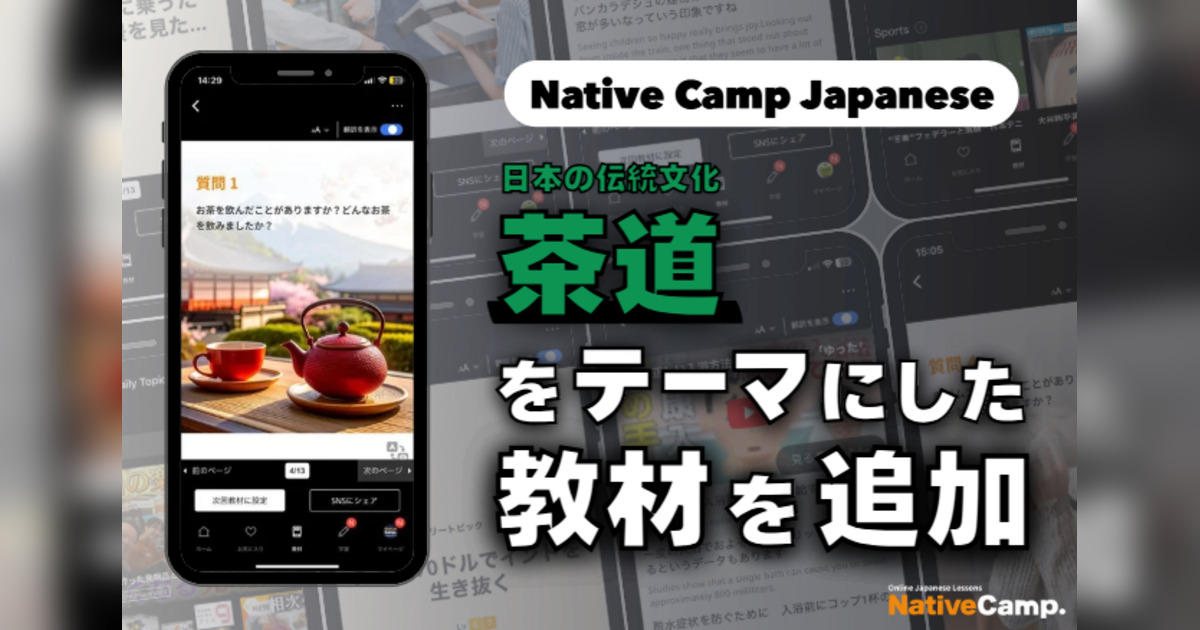 株式会社ネイティブキャンプ(本社:東京都渋谷区、代表取締役社長:谷川国洋)が提供するオンライン日本語会話サービス『Native Camp Japanese』では、このたび、人気教材「デイリートピック」に”茶道”をテーマにした教材を追加しました。