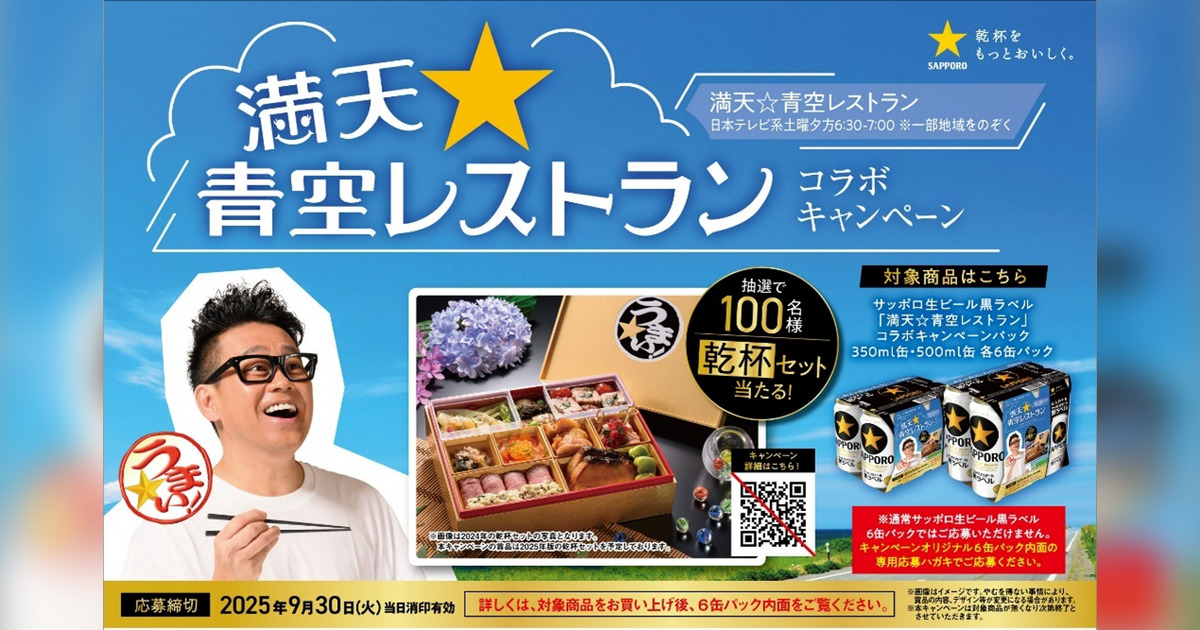 サッポロ生ビール黒ラベル「満天☆青空レストラン」コラボキャンペーンパックのスリーブ内面に印刷された専用応募ハガキで応募できるクローズドキャンペーン。「満天☆青空レストラン 乾杯セット2025」が抽選で100名様に当たります。