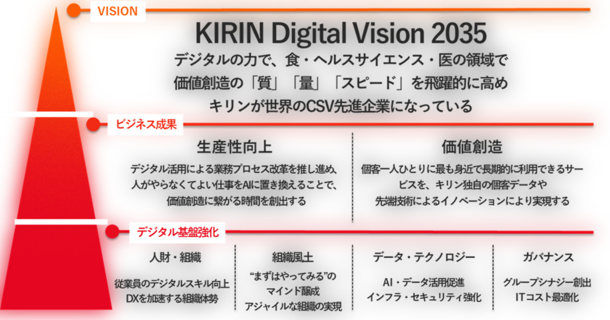 キリングループは、「KDV2035」のもと、「人がやらなくてよい仕事をゼロにする(=生産性向上)」と「人と共に価値を生み出す仕事を加速させる(=価値創造)」をビジネス成果の二本柱とし、それらを支えるデジタル基盤を強化することで、食・ヘルスサイエンス・医の領域で価値創造の「質」「量」「スピード」を飛躍的に高め、世界のCSV先進企業となることを目指しています。